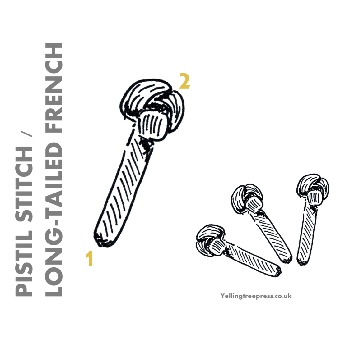 It’s formed very similarly to a French knot. However, whereas with a French knot you insert the needle back into the fabric, close to where it came out, with pistil you insert it a little way away – so as to create a tail.