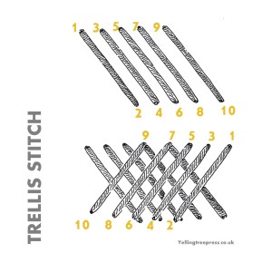 Trellis is a really versatile stitch – you may like to trellis on top of a laid work background. Or include a decoratiive stitch within each ‘square’ of the trellis.
